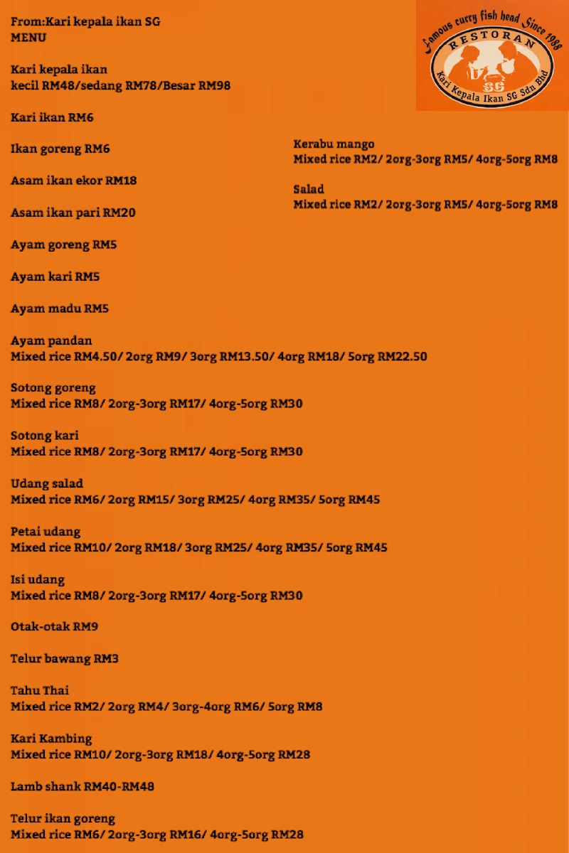 Welcome to Kari Kepala Ikan SG, a culinary gem nestled in Batu Caves, Malaysia. Established in the late 1980s, this restaurant has built an impressive reputation for its exquisite fish head curry, celebrated for its rich, flavorful gravy and fresh ingredients. The menu features signature dishes like the Big Fish Head Curry and Asam Pedas Ekor Ikan, showcasing a unique fusion of traditional recipes with a milky twist, highlighting the use of santan that adds depth to every spoonful.